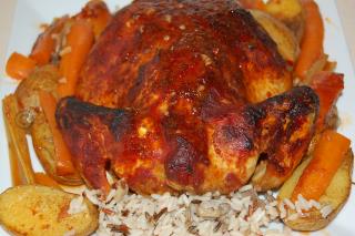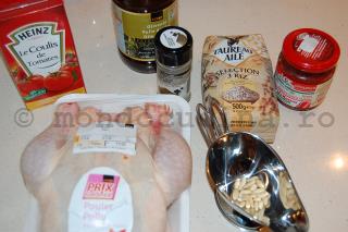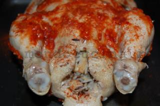 Umpleti puiul cu pilaf. Faceti un sos gros din usturoi macinat, pasta de ardei iute, 2 linguri de ulei de masline, 5 linguri sos tomate, sare. Ungeti puiul pe toate partile. Condimentati puiul cu boia si piper.