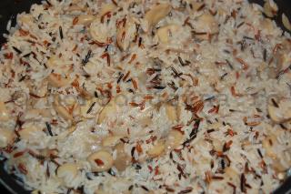 Faceti pilaful cu ciuperci. Tocati ceapa si caliti-o, adaugati ciupercile, orezul. Adaugati zeama de pui si fierbeti la foc mic pana scade bine si orezul e fiert.