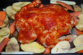 Ungeti din cand in cand puiul cu sosul tomat si cu sosul din tava. E gata in aproximativ 50 de minute, cand legumele sunt coapte si puiul e bine rumenit.